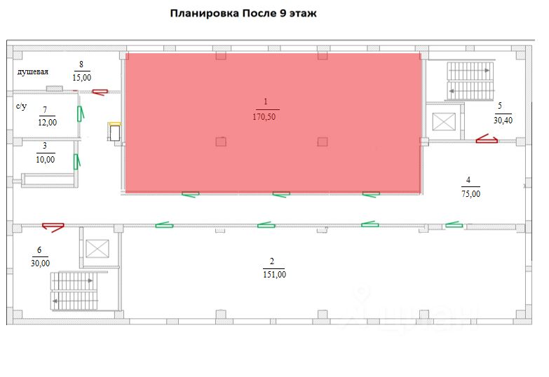 Характеристики: - освещение. - отопление (центральное). - потолок (высота 5 м), - пол плитка, - санузел на этаже, - два лифта, - кафе, столовая,