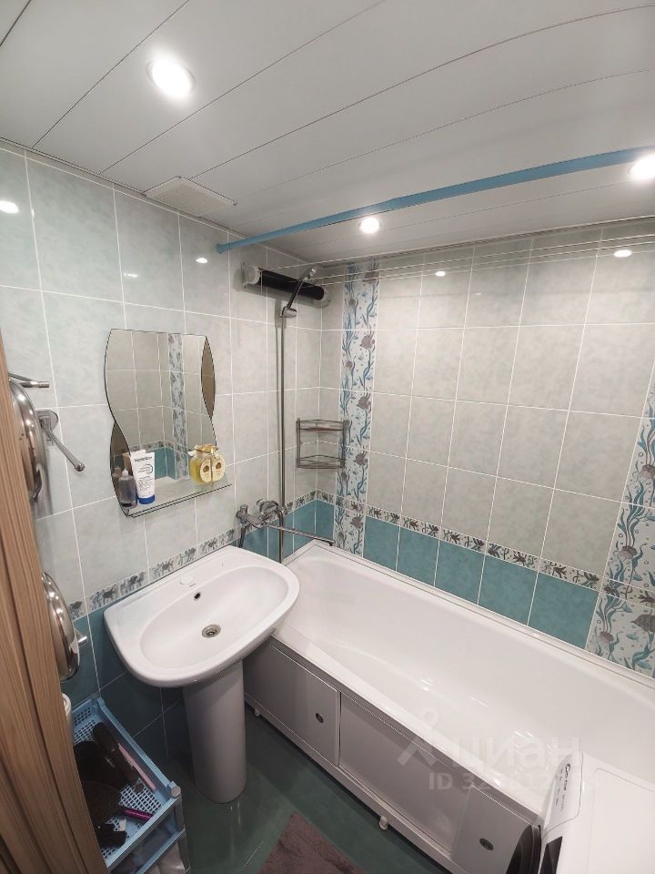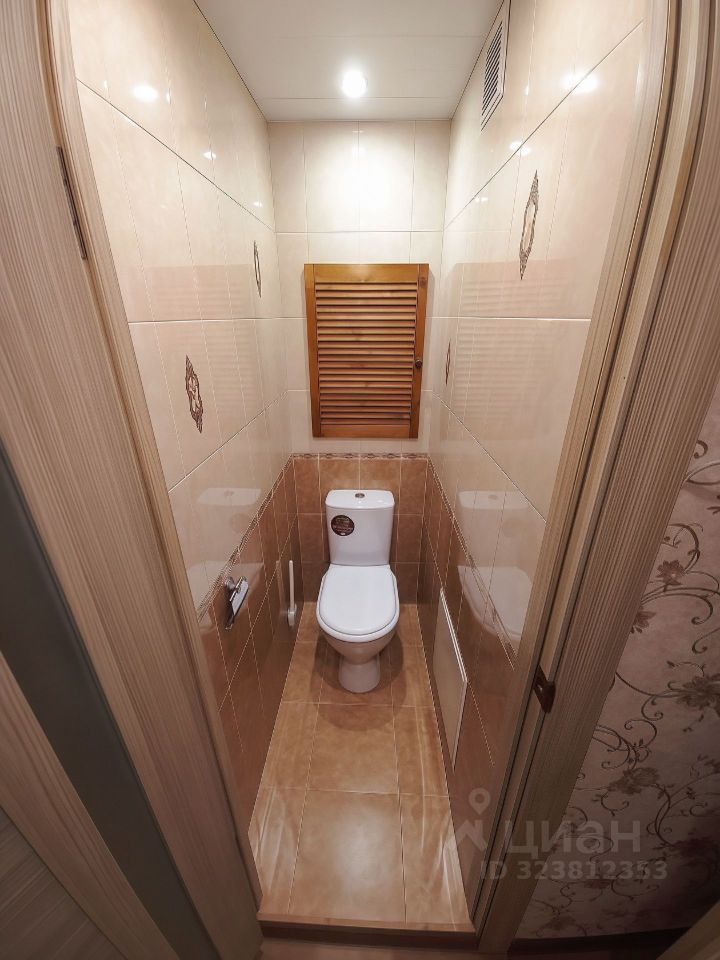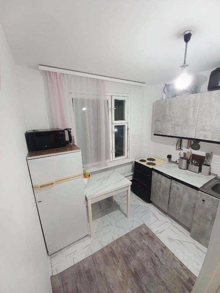 Кухня аккуратная, выполнена в светлых тонах, с плиткой под мрамор, вся необходимая техника остаётся. Санузел раздельный, в отличном состоянии, выложен кафелем. В прихожей — встроенные шкафы, дополнительные системы хранения.